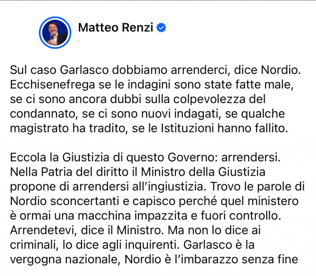 GARLASCO – Si riaccende il dibattito sul caso Garlasco dopo le parole di Matteo Renzi, che sui social ha criticato duramente il Ministro della Giustizia Carlo Nordio. L’ex premier, commentando l’ipotesi di uno stop a ulteriori indagini sull’omicidio di Chiara Poggi, ha parlato di «resa all’ingiustizia» da parte del Governo e ha definito il caso «vergogna nazionale». Un’affermazione che ha immediatamente suscitato polemiche, soprattutto nella cittadina. A replicare è stato l’assessore di Garlasco, Riccardo Invernizzi, che ha pubblicamente contestato i toni utilizzati dal leader di Italia Viva: «Caro Senatore Renzi, questa espressione se la poteva e se la doveva risparmiare. È un’argomentazione utile solo per fare un click in più: un concetto sbagliato, offensivo e lontano dal vero. Non lo meritano le famiglie coinvolte e nemmeno la nostra comunità». Invernizzi sottolinea come da anni attorno ai fatti di Garlasco si continui a speculare: «Non ci si ferma a riflettere e non si condanna uno dei più terribili femminicidi di sempre: ci si focalizza su filoni fantasiosi, luoghi comuni dannosi, frasi utili per fare audience ma non per chiarire la verità. L’unica certezza è che è morta una ragazza in modo indegno in una città che ha avuto il solo demerito di esserne lo sfondo. Non perché a Garlasco ci siano streghe o sette misteriose: Chiara era di Garlasco, e basta». L’assessore Invernizzi respinge con forza l’etichetta di «vergogna nazionale»: «È un’espressione goffa e fuorviante, usata per un attacco personale al ministro Nordio. Dietro quelle parole ci sono cittadini che non hanno nulla da cui doversi vergognare, famiglie che soffrono e professionisti che lavorano per cercare la verità». Quindi la richiesta finale: «Ci deve delle scuse, Senatore Renzi. Garlasco è commercio, associazionismo, impresa, cultura, lavoro e impegno. Una comunità che va avanti con orgoglio. Altro che vergogna nazionale». Intanto il dibattito politico e mediatico continua, mentre la città chiede silenzio, rispetto e giustizia.