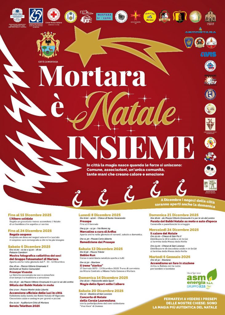 MORTARA – L’unione fa la forza, e a Mortara non è uno slogan ma un fatto: i 27 loghi stampati sul manifesto presentato lunedì in aula consiliare raccontano più di mille parole, perché dietro quel cartellone c’è il lavoro di altrettante realtà del territorio – associazioni, gruppi, volontari, commercianti – che per la prima volta hanno scelto di costruire insieme un calendario unico e condiviso per il Natale 2025.