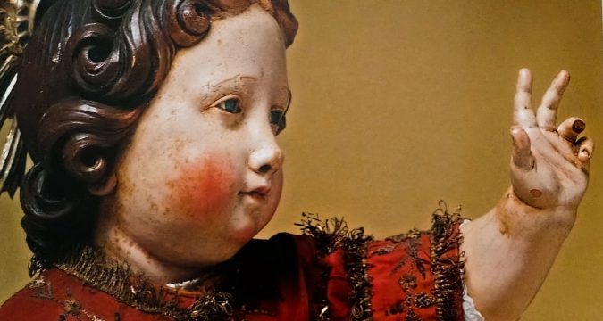 La tradizione di vestire le statuette del Bambino Gesù è una pratica che affonda le radici nella devozione popolare, in particolare in quella legata al Bambino di Praga. La storia inizia nel Seicento con Santa Teresa d’Avila, grande mistica e riformatrice carmelitana, che donò una statuetta alta 47 centimetri alla principessa Polissena. Opera di un anonimo scultore spagnolo, essa presenta caratteristiche iconografiche significative: la mano destra è alzata in segno di benedizione, mentre la sinistra sostiene una sfera dorata, simbolo del mondo, sormontata da una croce. La corona che adorna il capo del Bambino Gesù simboleggia la pace e l’autorità divina. Ogni abito confezionato è frutto di un lavoro amorevole, realizzato con materiali di pregio, e rappresenta un dono personale e sincero da parte dei devoti. È di grande fascino religioso pensare anche a quanti uomini e donne si siano inginocchiati ai suoi piedi, pregando per affrontare piccoli e grandi problemi della vita quotidiana. Questi esemplari sono difficilmente visibili, poiché conservati in apposite teche ed esposti solo in occasioni speciali per la venerazione dei fedeli. Negli anni abbiamo raccolto tessuti antichi tinti con colori vegetali, frammenti e pezze, il cui esemplare più antico risale alla metà del Cinquecento. Numerose sono anche le matassine di fili in metallo — bronzo, oro e argento — così come le passamanerie finemente lavorate e intrecciate. Prendendole sul palmo della mano, se ne percepiscono il peso e la grammatura e, allo stesso tempo, il “freddo” che testimonia l’autenticità dei materiali utilizzati. Ancora oggi riceviamo richieste da privati e collezionisti che ci contattano per la creazione di nuovi modelli, per la manutenzione dei vestitini o per il loro rifacimento secondo l’epoca di riferimento.